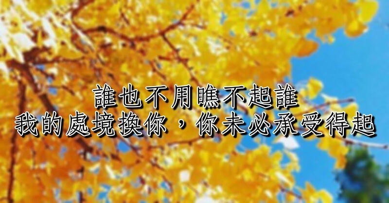 誰也不用瞧不起誰,我的處境換你,你未必承受得起... Kitty 2019-02-18 「我什麼都有,倒也不差你,我什麼都沒有,倒也不怕沒有你。」每個人都有無法言說的心事,每顆心都有冷暖自... ... Read More
