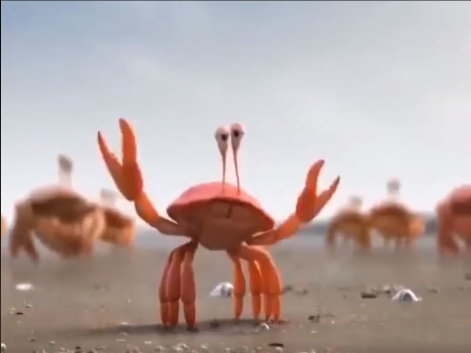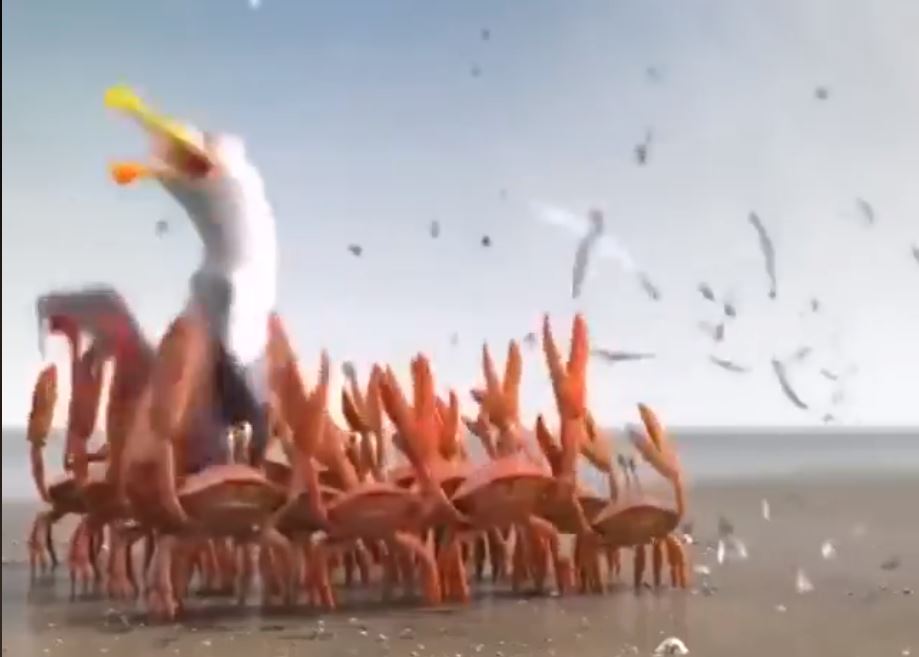接著,場景換到海邊,一隻虎視眈眈的海鷗鎖定了一隻小螃蟹,朝著牠飛過來,只見小螃蟹立刻用螯發出命令,下一秒成群螃蟹聚集在一起,用螯剔光壞心海鷗的全身羽毛。