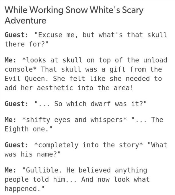 1.「當我在白雪公主歷險記設施工作的時候,客人問我:『不好意思,請問為什麼要把骷.髏頭放在那裡呢?』我回答他:『那是邪惡皇后要我們放的,我認為必須把自己的審美觀加在這裡。』」