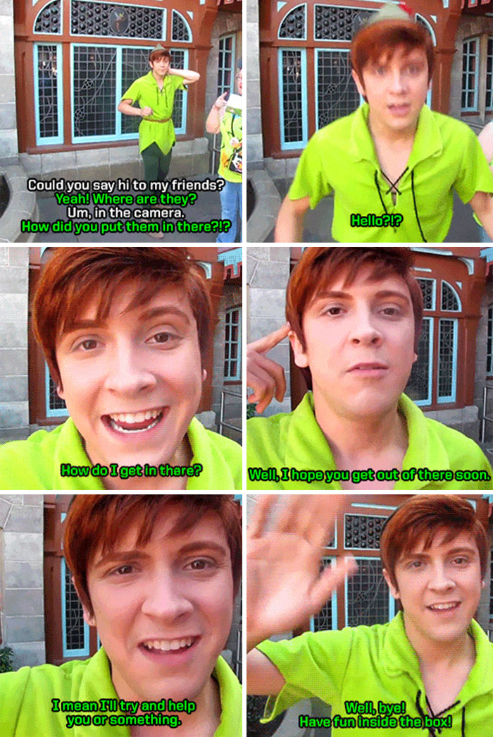 14.彼得潘不只穿得像彼得潘,就連講話也故意像小孩一樣天真,當遊客開視訊問他能不能跟朋友說聲嗨,彼得潘馬上天真回覆:「哈囉!?你是怎麼把我放進這個盒子裡的?我希望你趕快從盒子裡出來,好吧掰掰,在盒子裡玩得愉快!」