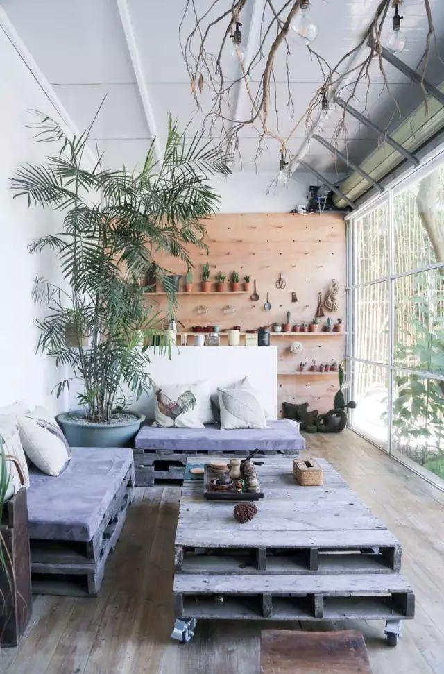 沙發、茶几都是用廢舊的木材改造的,環保、復古、樸拙,充滿了原生態氣息
