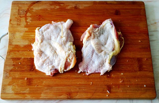 1、兩個雞腿用刀從中間劃開,去除骨頭;