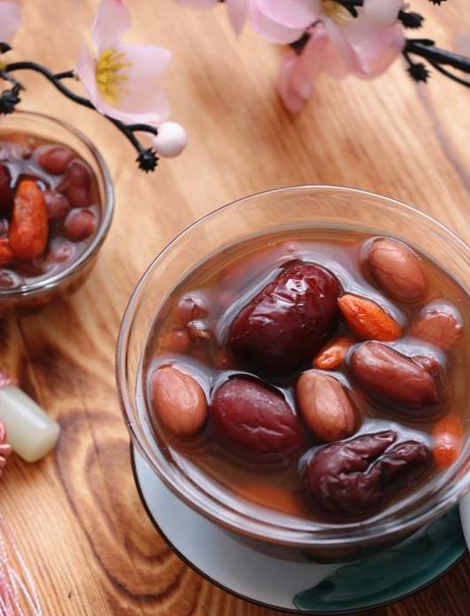 1.紅衣花生,紅棗,紅豆,枸杞子及紅糖,分量沒有嚴格要求,每種抓一點。紅豆需洗淨提前2小時浸泡,因為紅豆是洗乾淨再泡的,泡紅豆的水也不要掉倒,可以用來煮湯。