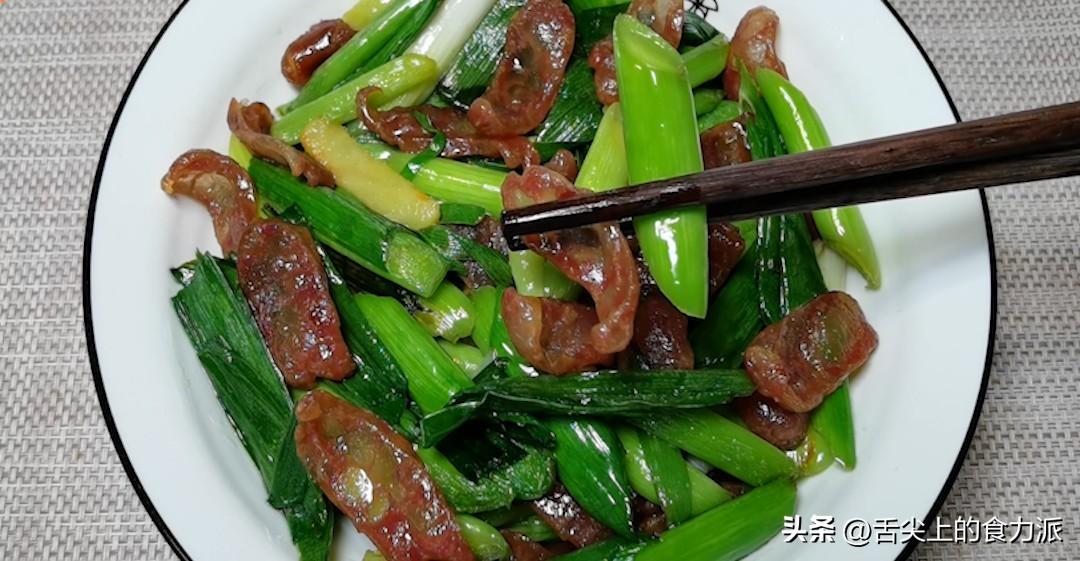 2、蒜苗葉容易熟,需要單獨擺放,蒜苗葉同樣斜刀切段。