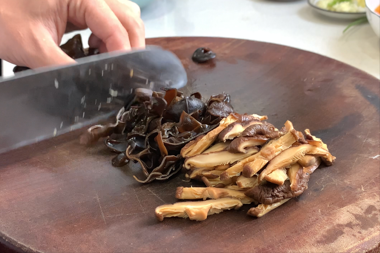 步驟2:香菇和木耳泡發,然後切絲備用。