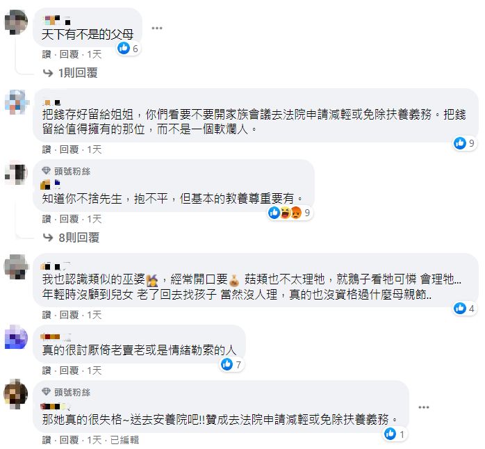 貼文曝光後也吸引大批網友討論,大家紛紛留言說到「開口閉口都是要錢的婆婆,讓人很賭爛」、「天下有不是的父母,她是真的失格」、「真的很討厭倚老賣老或是情緒勒索的人」、「又是一樁道德情緒勒索」、「不是不孝,而是要對的人而孝」,不少人也都認為原PO婆婆沒有身為媽媽的模樣,碰上這樣的「親情債」真的很難還。