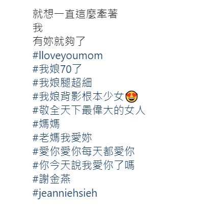 謝金燕也透露,其實自己對於外界流言蜚語,可以一直用堅定的心情去面對,全都是因為有媽媽的手牽著,也才能挺過這段崎嶇的演藝之路,她也甜蜜曬出母女合照,雖然背對著鏡頭,但是有如小女孩般攬著媽媽的手,一方面依靠著對方,一方面守護著對方,她也傾訴心中感情:「老媽我愛妳,愛妳愛妳每天都愛妳!」讓很多網友看了都十分感動。