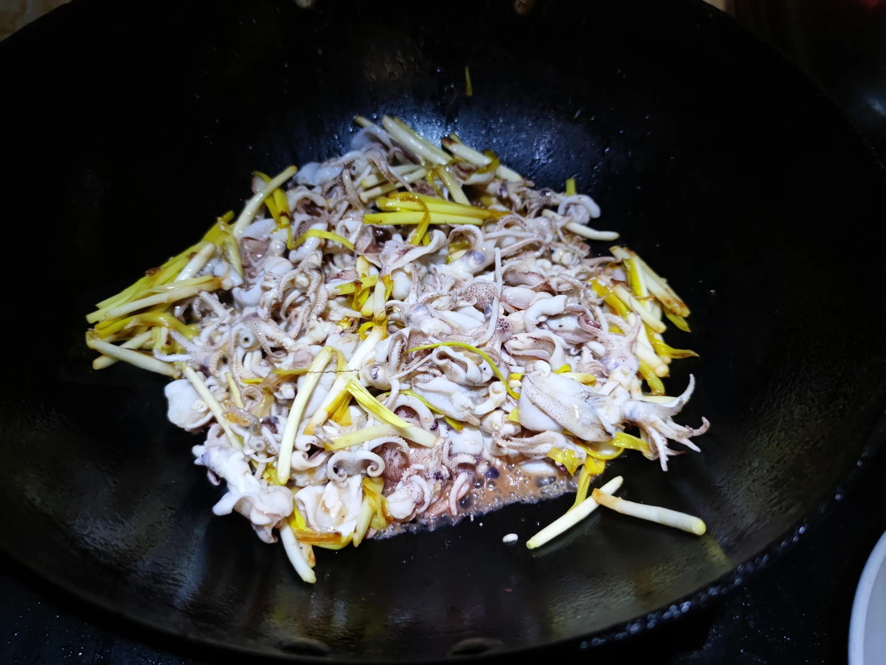 4.焯燙好的海兔擠干水分,撒上少許鹽拌勻入鍋,跟蒜苗一起翻炒均勻,加入少許蚝油提鮮即可出鍋。
