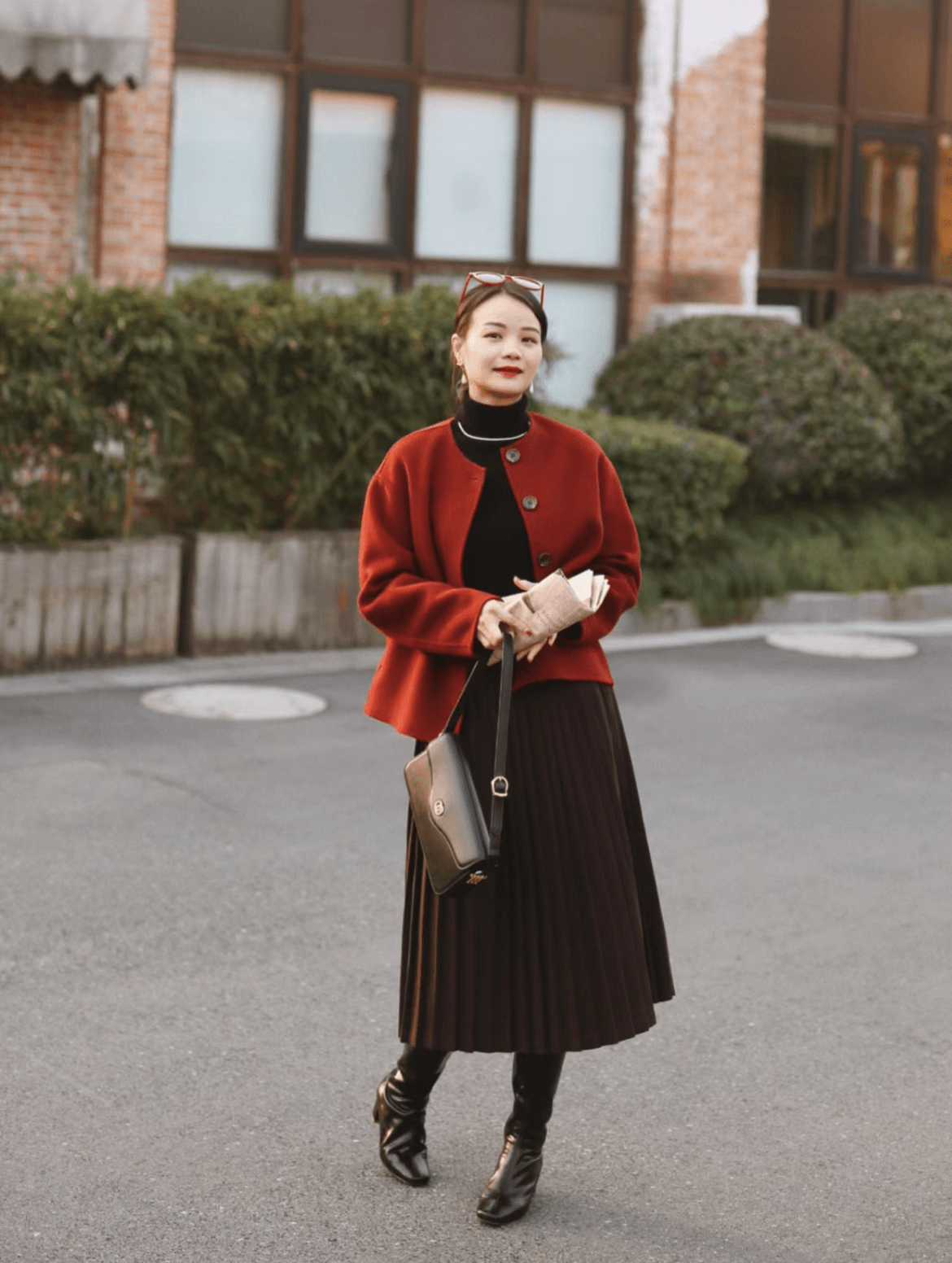 紅色是一個極有存在感的顏色,如果選擇了紅色的外套穿在身上,那麼身上其它單品的顏色就不宜添加得太凌亂,否則全身上下都是亮點就會讓人看得眼花繚亂了。大多數時尚博主都會選擇統一內搭顏色的穿法。比如:紅色短款大衣+黑色打底+黑色百褶半裙,簡約大氣又不失明艷風情,亮點明確,風格突出,看似簡單的一套Look,卻散發著醇厚濃郁的極致復古腔調,值得人反覆鑒賞。