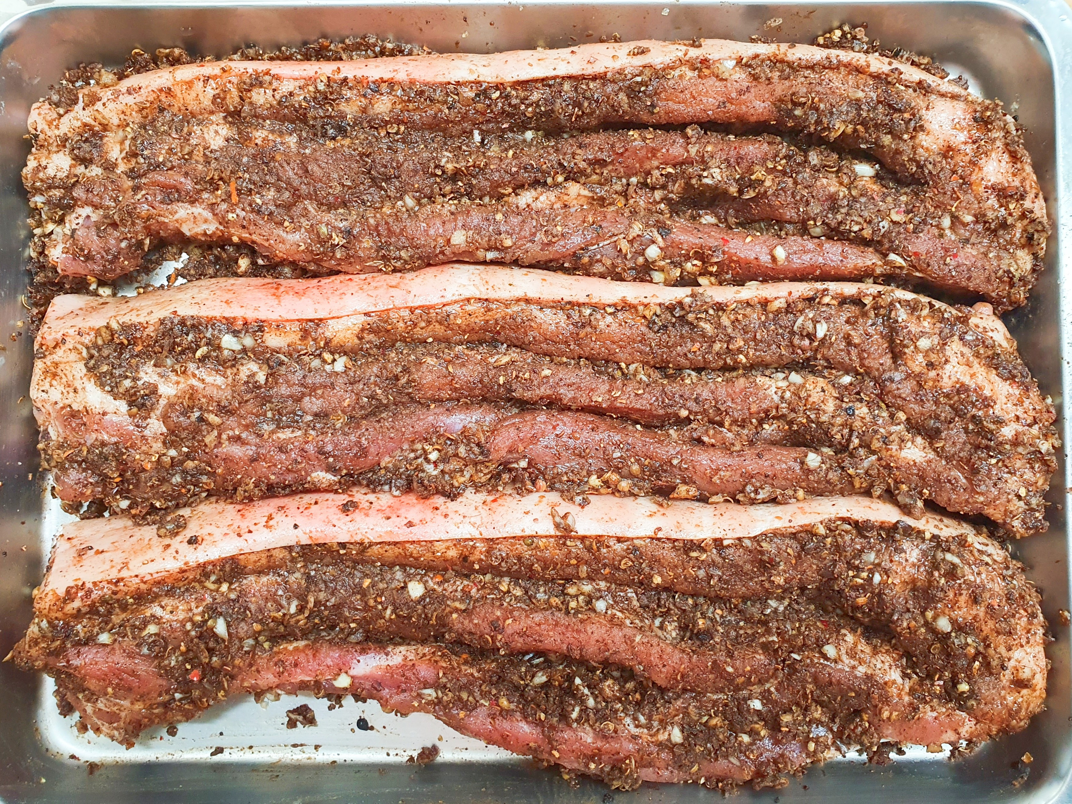 原PO表示自己已經採買多次的客家鹹豬肉,常常發現豬肉的其中一面佈滿燒焦痕跡,且三片豬肉都有,不過另一面賣相卻相當良好,燒焦的那面全部「反面放置」,忍不住質疑是不是有欺騙消費者的嫌疑。