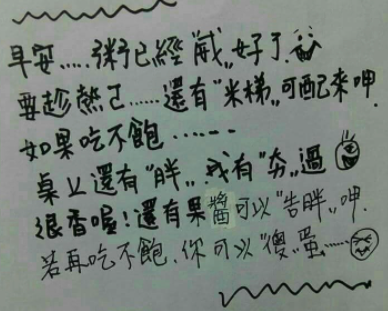 根據ETtoday報導,最近有網友在臉書《爆廢公社》附上一張字條,從畫面中可以看到字條寫著:『早安,粥已經「威」好了,要趁熱喔,還有「米梯」可配來呷。如果吃不飽,桌上還有「胖」,我有「夯」過,很香喔!還有果醬可以「告胖」呷。若再吃不飽,你可以「傻蛋」。』,並在文末詢問大家是否有人看得懂。