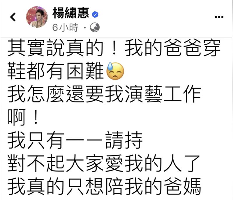 楊繡惠在台北一邊工作,一邊照顧年邁的父親、母親,今天她突然發文說,連爸爸穿鞋子都有困難:「我怎麼還要我演藝工作啊!」也語重心長地說:「我只有一一請持(請辭),對不起大家愛我的人了,我真的只想陪我的爸媽!」消息一出讓大家都震驚不已。