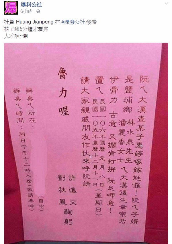結婚是天大的喜事,滿滿的邀請心意都濃縮在一張小小的喜帖上!但有網友分享在臉書爆料公社的這份草根味十足的請帖,真的讓人大開眼界啊!不少網友一開始還看不懂,直到答案出來都紛紛笑「太有人情味了!」。