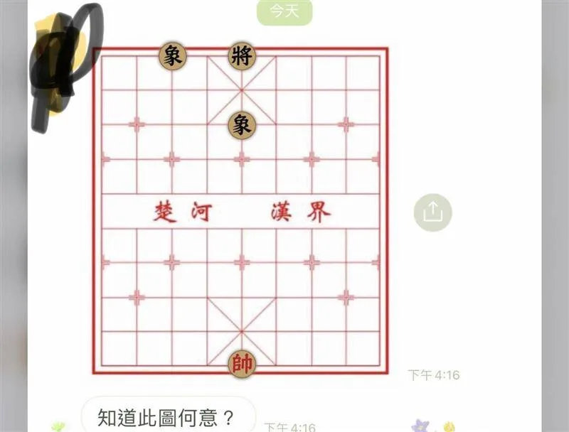 原PO在社群平台《批踢踢實業坊》中發文表示,當天公司的女主管突然傳了一張象棋的殘局圖,並傳訊息問他:「知道此圖用意?」只見圖中棋盤楚河漢界的兩側分別有著2支「象」和「將」,另一邊的紅棋方則是剩下1支「帥」,整盤棋的結果看起來就是和局而已,似乎沒有什麼特別的意義。