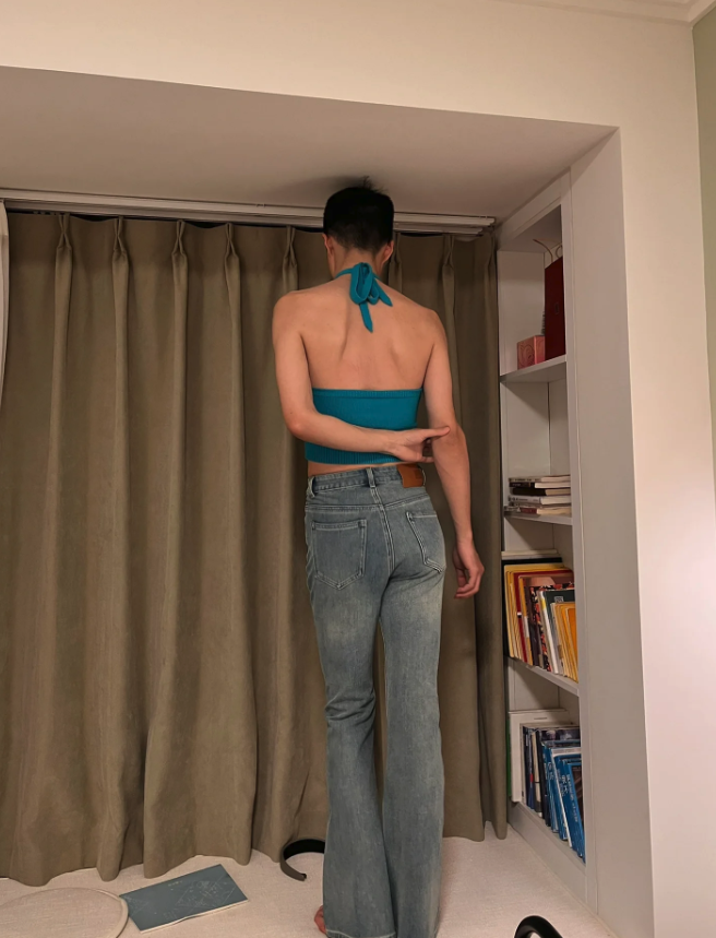 男友的身高比例本來就非常不錯,穿上貼身牛仔褲竟莫名有種名模的氣勢,露背的背心也展現出他漂亮的背部線條,怎麼可以穿起來比女生還美啦~~