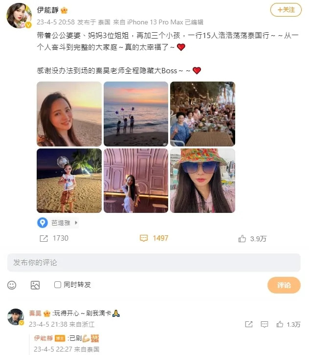 其實伊能靜婚後過得相當幸福,也經常分享被老公捧在掌心疼的舉動,她曾分享之前帶公婆等全家15人浩蕩去泰國旅遊,老公雖沒同行,一句「刷我卡」霸氣舉動,也閃瞎大批網友。