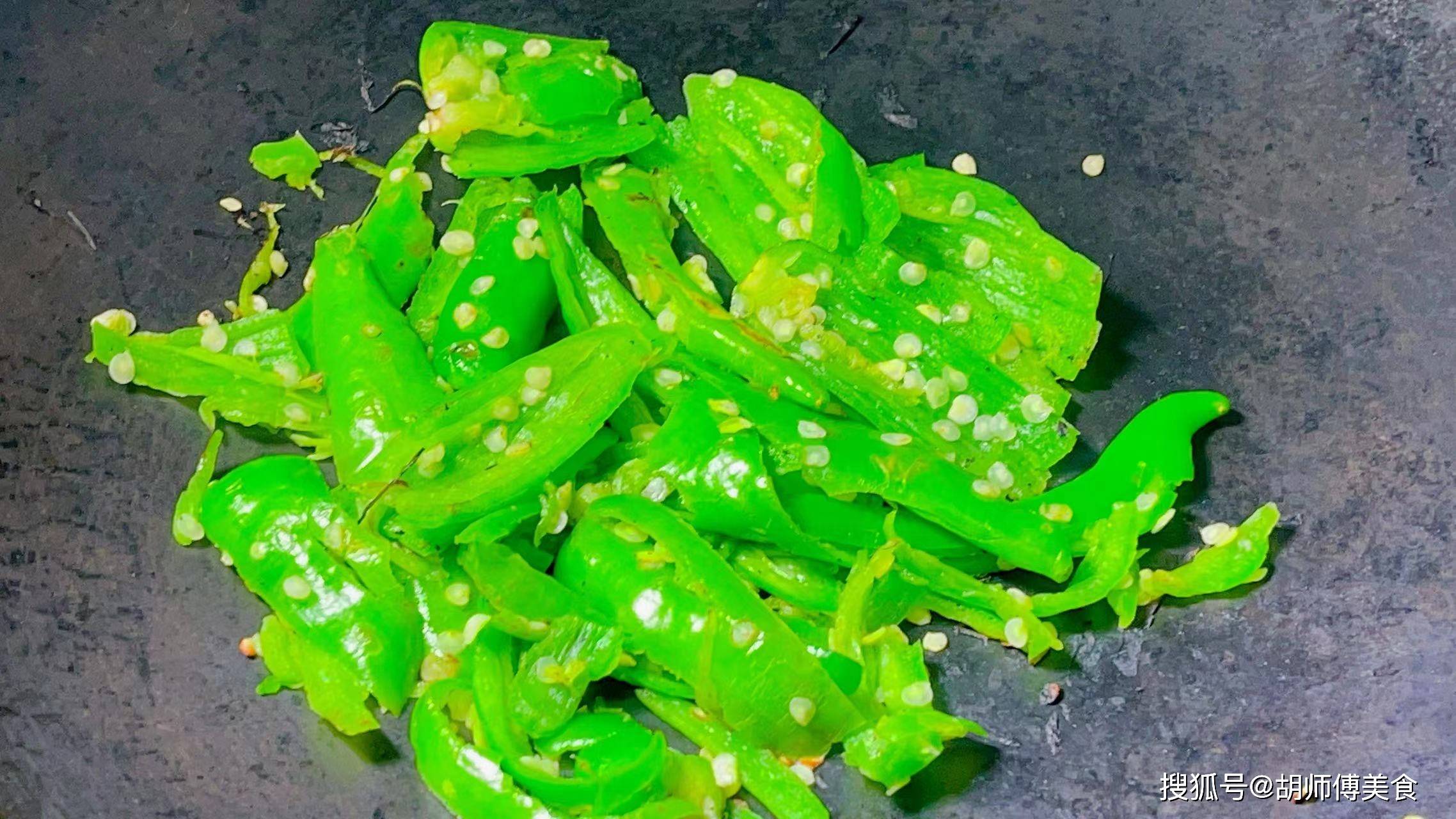 3、接著再把青椒放入鍋中,慢慢用鍋鏟砸青椒,直到將青椒炒的也斷生就可以起鍋備用了。