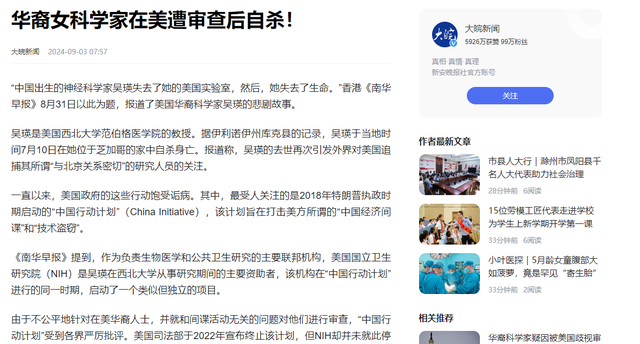 雖然這個計劃在拜登政府上台後叫停,但相關的餘波並未平息。吳瑛生前的研究經費、來自美國國立衛生研究院(NIH),而這個機構恰好在對華裔科學家進行著緊密的調查。吳瑛就此被盯上,這層壓力可能是壓垮她的最後一根稻草。吳瑛的自殺不僅是個人悲劇,更是某巨大問題的冰山一角。學術壓力、政治審查、失去科研的意義...這些無形的重擔,最終把這位卓越科學家逼到了絕境。
