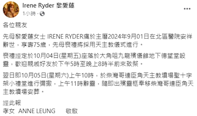 願逝者安息!70年代當紅的資深歌手黎愛蓮(Irene Ryder)、近日傳出離世消息,享年75歲,其愛女Anne在臉書發出訃聞,表示喪禮將於下月4日、採天主教儀式進行。黎愛蓮生前曾和「火雲邪神」梁小龍有過一段婚姻,後來遭到陌生人襲擊、不幸毀容,不得已退圈治療,甚至罹患抑鬱、多次尋死...
