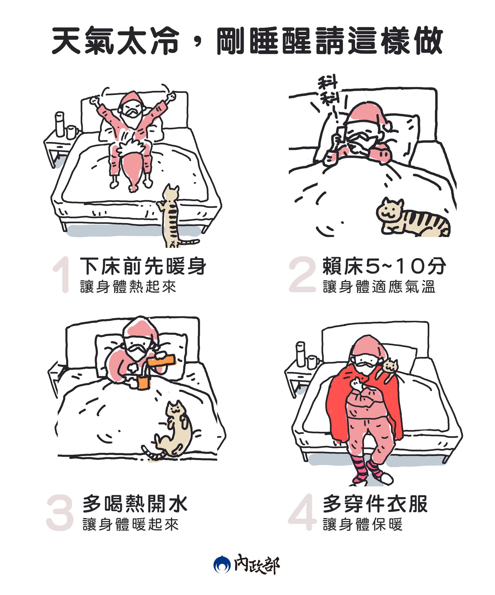 內政部最後幽默表示,在寒冷的冬季,如果有人質疑你總是賴床,大可以理直氣壯地回答:這是為了確保生命安全的必要之舉。除此之外國健署進一步分享寒冬護心「3大秘訣」:首先起床時,謹記「慢、熱、起、穿、行」的口訣,分別是先在床上緩慢活動一下、伸展四肢熱身、再慢慢坐起、穿上保暖衣物、扶著床邊穩步行走。第二、出門前的穿搭建議:建議根據天氣變化適時增添衣物,內層選擇較貼身的長袖衣物,外層選擇較寬鬆且防水、防風的長版外套;最後進門後的回暖方式:從寒冷戶外進入室內後,應讓身體逐步回暖,再洗熱水澡,避免溫差過大引發血管擴張,且洗完也要注意身體與室內的保暖。