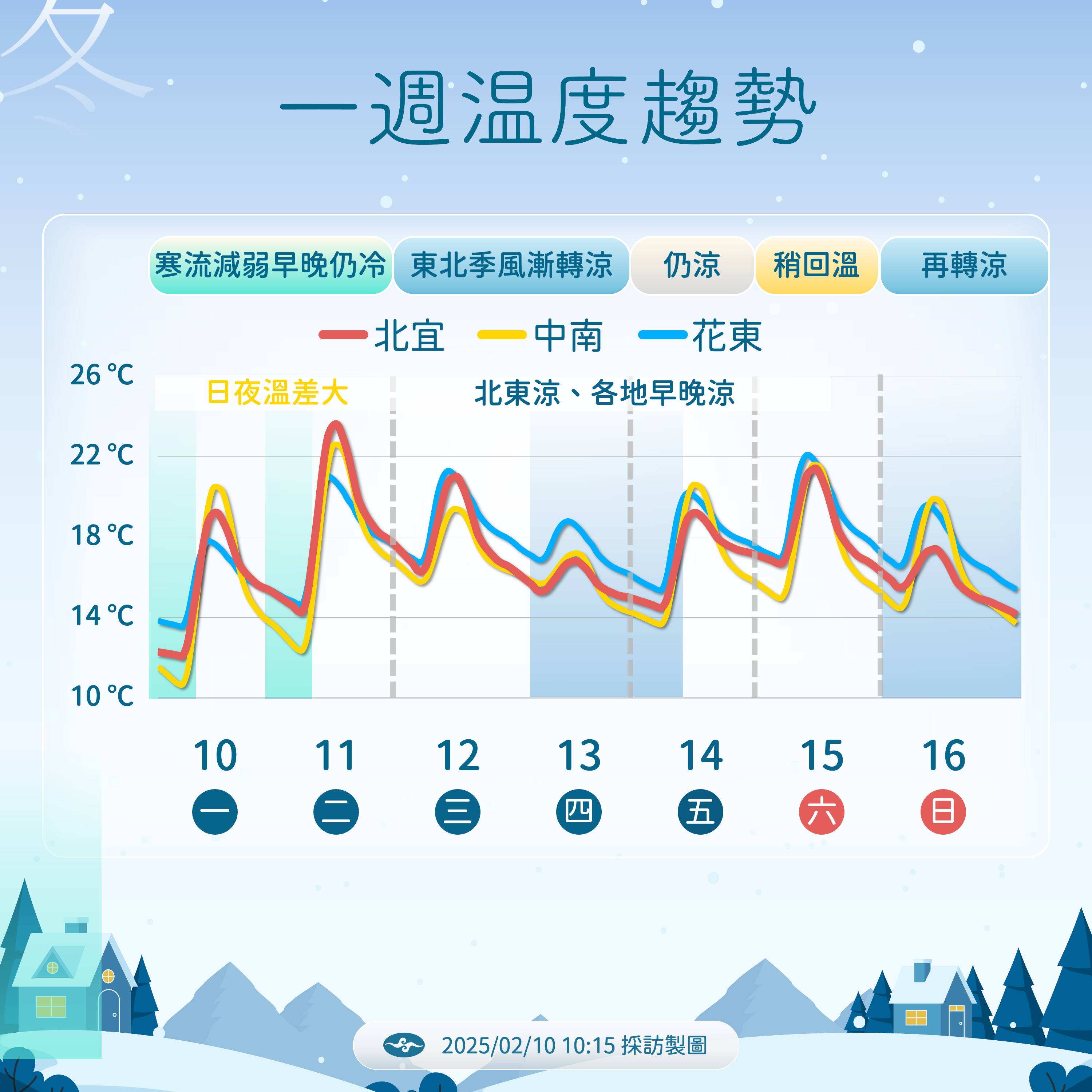 特別提醒大家要注意,下週三開始氣溫可能會明顯下降,除了山區會出現零星降雨外,還很可能會受到強烈大陸冷氣團影響。到了下週四,北北基宜會出現局部短暫雨,花東地區和恆春半島也可能會有零星降雨。由於超過5天後的天氣預報變動性較大,建議大家要持續關注最新的氣象資訊。