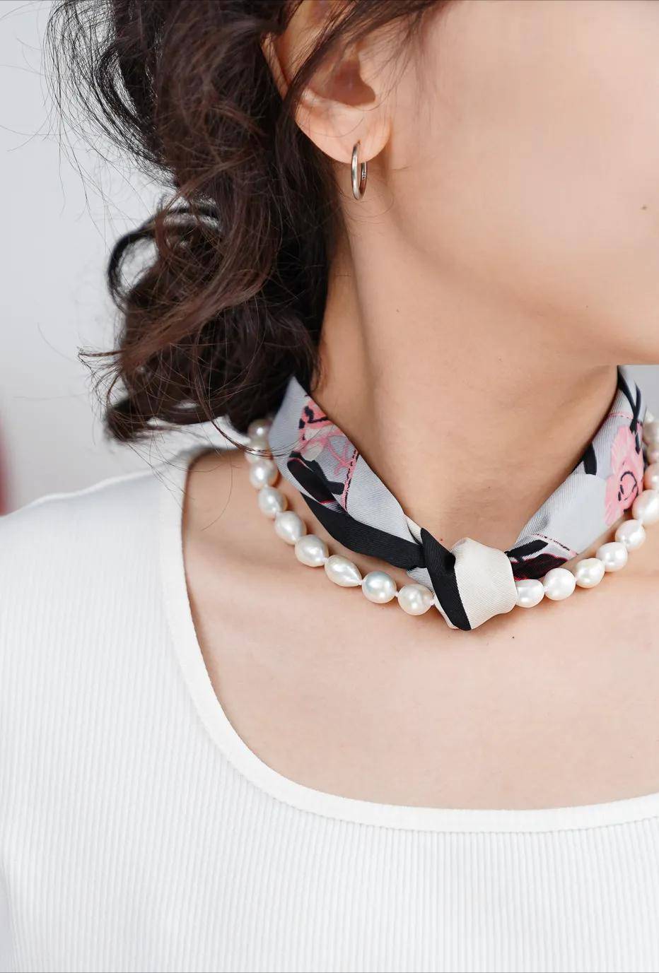 只需要在出門前花一分鐘時間戴上珍珠絲巾,基礎的衣服也能變得亮眼。而且珍珠的光澤可以襯得人不那麼黯淡,而是有氣色的。