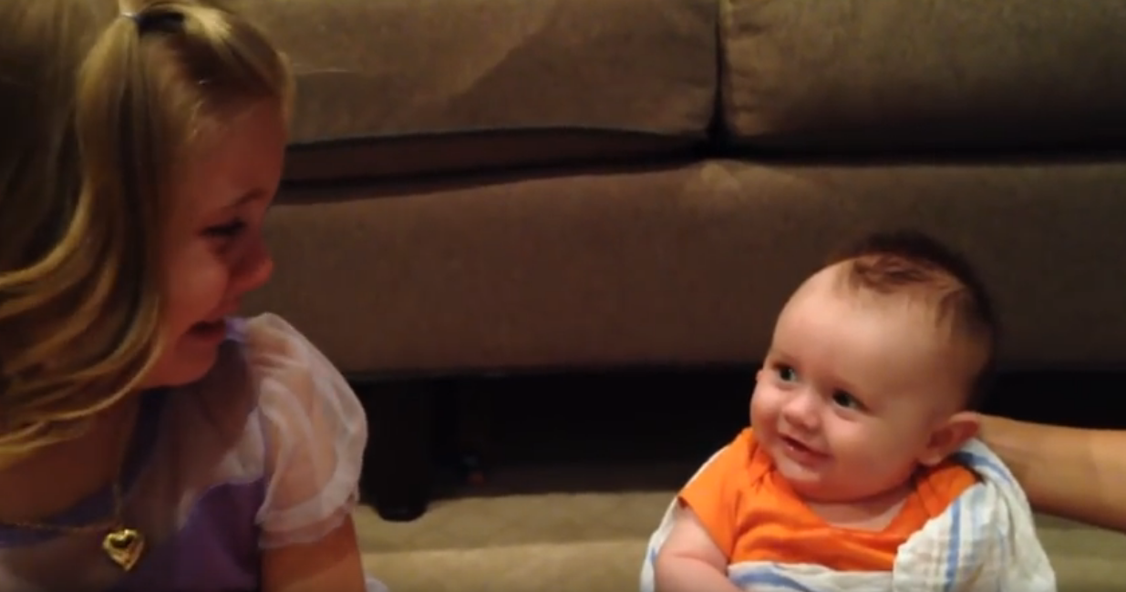哭到泣不成聲的她,轉頭看向她最愛的可愛小寶寶,結果弟弟居然對她露出一個好暖的微笑!