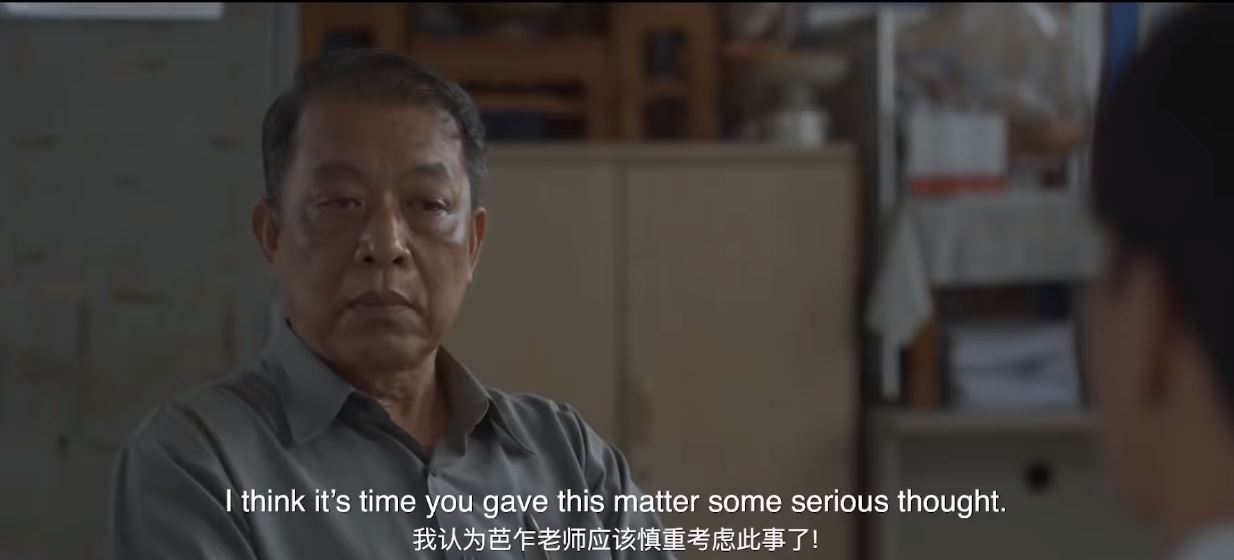 影片一開始,小男童的視線被後方的奶奶吸引,直到老師點到他的名字,他才回過神來,原來這位坐在後面睡著的老奶奶是這個班級導師的媽媽,她患有失智,以至於不能一個人獨處,而老師為了能就近照顧母親,每天都帶著她一起到學校。