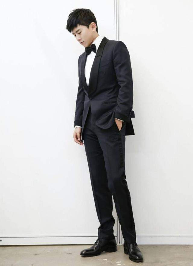 相對來說鄭愷的這身很亮了,藏藍色西裝搭配一雙亮麗的黑皮鞋