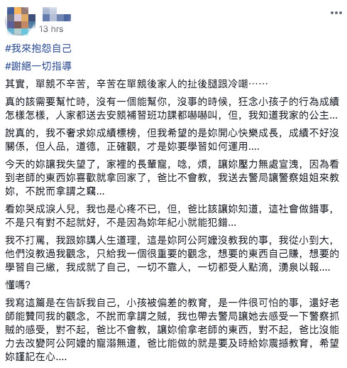 根據《ETtoday新聞雲》報導,這位爸爸在臉書「爆怨公社」發文,表示對他來說,當單親爸爸其實一點都不辛苦,不過長輩們的「扯後腿」、「冷嘲熱諷」,卻常常讓他很難受,每次需要幫忙的時候都不見人影,但只要碰到孩子學業相關的問題,就會一堆人站出來指手畫腳,就連還在唸書的女兒,也被這種氛圍搞得心中充滿了壓力,並在無處宣洩之下,學習到了偷竊,在日前順手摸走老師桌上的東西,讓他得知後感到心碎不已。