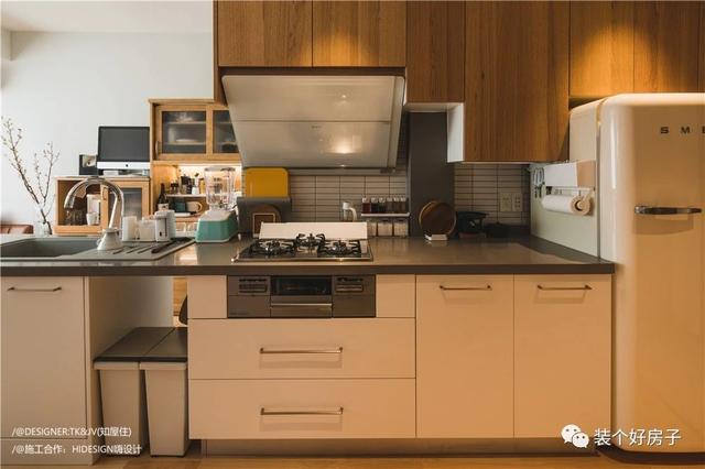 水槽下方左側是裝廚餘的濕垃圾桶,右側是乾垃圾桶,考慮到垃圾分類及垃圾桶的位置,高度剛好可以滿足按壓蓋彈起的空間,垃圾桶的背後空間還收納了摺疊凳,尺寸剛剛好。