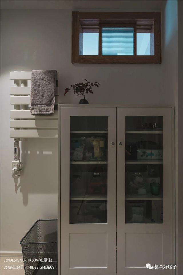 洗漱台的背後是一個專門的收納櫃。這裡也能充分體會到分離式衛浴的好處,如果是傳統衛浴空間,潮濕和異味,根本沒法做太多收納。而這個只有48㎡的小家,可以擁有一個面積如此寬敞的分離式衛生間,可以說是相當舒適與便利了。