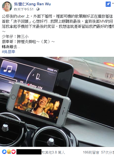 而因為合作而培養出好感情的吳慷仁,兩人除了是好友,更視他為演藝圈好前輩,過去拍攝《憤怒的菩薩》時,就曾因為對戲被吳朋奉「衝康」,在片場笑不停,可見兩人好交情,昨天他也低調現身,沒有受訪就離去,不過事後也在臉書上表示,搭車回家的路上,司機剛好放到《浪子回頭》這首歌,讓他覺得非常巧合,於是閉上眼睛欣賞,最後看到前輩露出笑容,忍不住用手機拍下,感性地表示:「我想這就是哥留給我們,最好的禮物。」