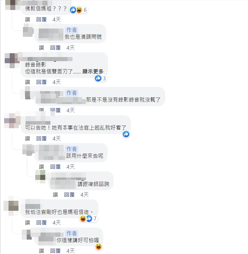 由於已造成婚姻危機和家人間的不愉快,問題也就此升級,讓女網友認為事態嚴重,於是向網友請益:「靈媒沒有任何證據,就胡亂說話,加上用長相批評,還造成後續這麼多影響,是否有法律責任?可以告她嗎?」隨後表示,若是鬧上法院,乩身的論述以及堂嫂的態度,恐怕會讓法官啼笑皆非。