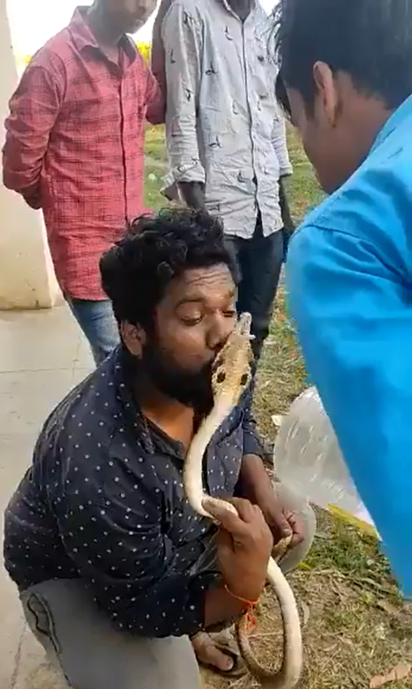 印度卡纳塔卡邦日前傳出蛇咬人的事件,一位名叫亞歷克斯(Alex)的男子近來從村莊中搶救出2條蛇,愛蛇成痴的他竟大膽朝其中一條眼鏡蛇親了下去,結果慘遭眼鏡蛇利牙咬進嘴唇,讓一旁圍觀民眾都嚇壞了!