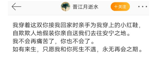 也是去年,微博上有個高達9億閱讀量的話題:晉江網文作者「月逝水」因丈夫出軌,留下定時發送的遺書後失蹤。