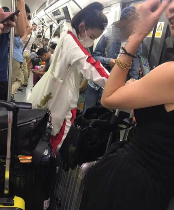 而在不久前,也有一位知名女星出現在地鐵車廂中。只見照片中的她扎了一個高馬尾,並穿著以白色為主、紅色為輔的全套休閒運動裝,背著迪士尼白色大包,戴上口罩,靜靜地滑手機。雖然全身幾乎包緊緊,但氣質與過人的美貌仍從眉宇間流露出來,被一旁的乘客捕捉,並上傳到網路上。
