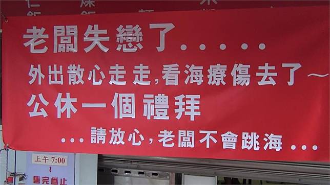 其實之前也有老闆貼出失戀的紅布條,上面寫著自己失戀了,「外出散心走走,看海療傷去了,公休一個禮拜」還在下面補充「請放心,老闆不會跳海...」本來以為這只是搞笑布條,但後來老闆出面表示自己是真的失戀了,所以放自己一個禮拜的失戀假期~
