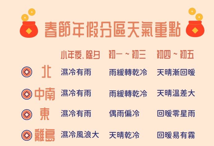 農曆春節馬上就要到了,很多人都趁這次連假要回家團聚,或是出去玩放鬆一下,大家都很關心,各地的天氣狀況怎麼樣;氣象達人彭啟明昨天(6日)救透露,目前預測狀況,從小年夜(8日)開始,一直到除夕(9日),全台灣都是陰雨的天氣,目前天氣變化再添變數,也可能出現超強冷氣團,氣溫驟降到10度以下,最新預測也出爐了。